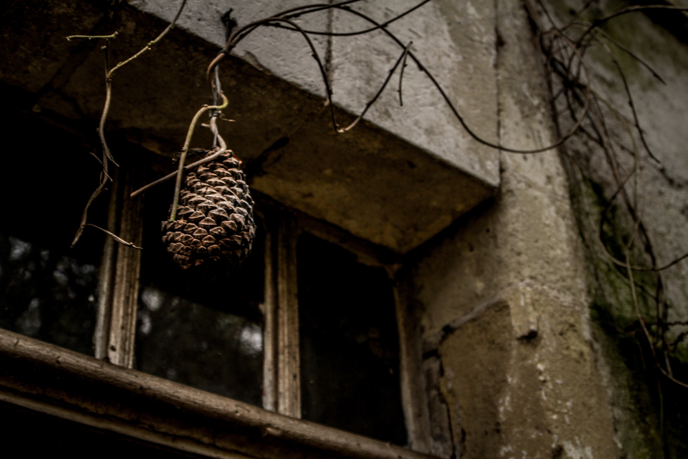 Cette maison de gardien n’a pas été épargnée par le temps mais il y demeure cependant quelques petits meubles de vie courante. Quant aux bouquets et pommes de pins suspendus, on ne sait s’ils ont été accrochés par les anciens propriétaires ou bien des promeneurs curieux, mais cela confère une certaine ambiance aux lieux.